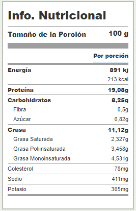 Este plato tiene un aporte de 213 calorías por cada 100 gramos. Ciertamente, Solo que tiene un contenido de proteínas de 19 gramos y su contenido de grasas es de 11 gramos. A continuación, te presentamos su tabla de nutrientes. Ya que, se te explica en base al tamaño de su porción. Es por eso, que es importante.